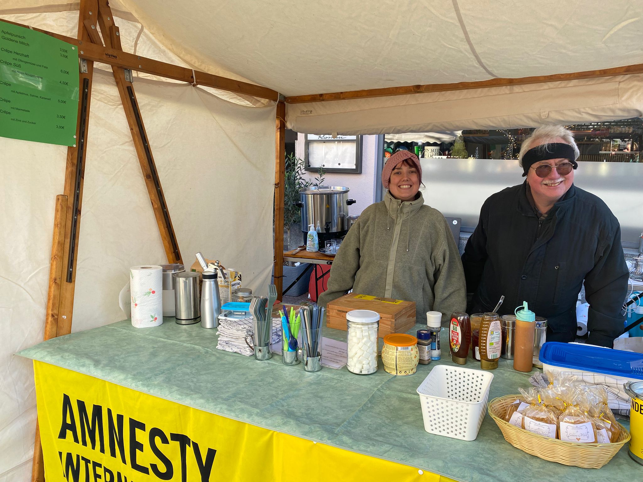 Am Stand wurden herzhafte und süße Crêpes frisch zubereitet, die großen Zuspruch bei Besucherinnen und Besuchern aller Altersgruppen fanden. Ergänzt wurde das Angebot durch wärmenden Punsch und Goldene Milch, die für eine gemütliche, einladende Atmosphäre am Amnesty-Stand sorgten.